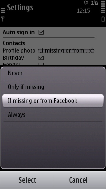 The settings page is a tad confusing; there are tick boxes for birthdays and gender. Going by the application’s help page, those tick boxes are meant to determine whether or not the respective data is changed on your local address book. However, contact entries on Symbian don’t have a field for gender. Neither are birthday dates overwritten with data from Facebook. Chalk those two down as bugs!