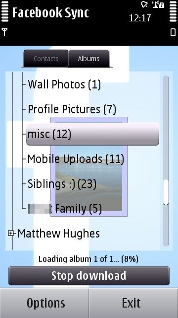 A final feature of Facebook Sync is the ability to download entire photo albums. Via the second of two tabs above the contacts list, one can browse for Facebook photo albums. Albums are grouped together by their owner, tapping a contact drops down a list of their albums. It isn’t possible to browse each photo; instead, the whole album is downloaded to the phone’s mass memory. Contact names and album names are mirrored in the directory structure when they are saved.
