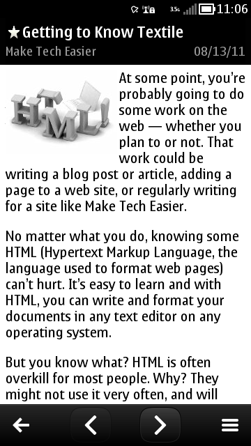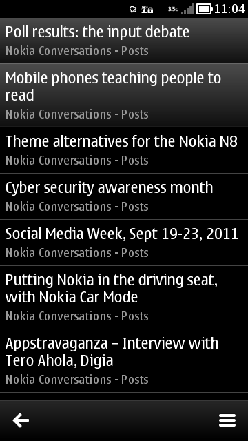 gNewsReader is one application of several that are pre-empting the Symbian Belle user interface. As such, we’re treated to the narrow status bar up top and a toolbar along the bottom. The graphics are pleasingly simple too, everything is black with grey bars and white text. This is perfect for conserving power on the AMOLED screens of Symbian^3 devices.