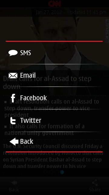 While viewing text stories, the toolbar icons change to show only “Back” and “Share” – somewhat staying within the Nokia Belle style guide. The Share menu launches all the options I consider mandatory for this type of application: SMS, Email, Twitter, and Facebook. Each news story leads with two bullet points that give context for those not familiar with the background of the story – as a reader, I appreciated this.