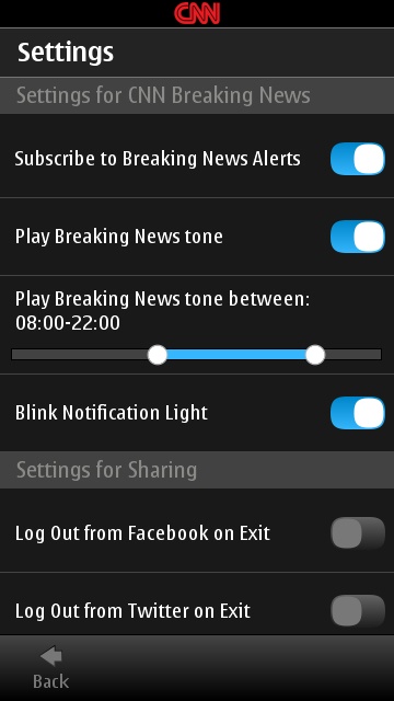 While most applications that stream video opt to use Symbian’s internal player, CNN has a custom player, which streams in high quality. Tapping the screen while videos are playing reveals controls for volume, timeline, pause, and back (to video selection). There’s no way to share a video though, which is a shame.