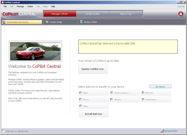 CoPilot Central is also where you can buy new maps, but, oddly, not subscribe to traffic updates. You have to visit the CoPilot web site for that. It would be a good idea to add which maps (and versions of maps) you have on the device in this PC client.
