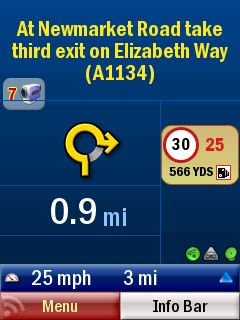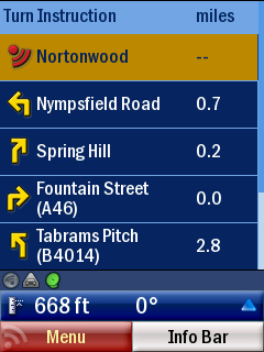 Useful instructions such as what exit to take (and road name) are there, but I feel that it’s again a bit small for glances. On the main view I feel the onscreen instructions, such as which exit to take (especially for roundabouts), should be bigger. Programs like Route66 trump it here, with the large, simple clear icons.