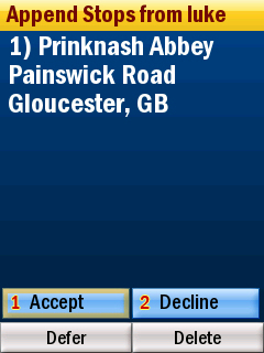 Updated destinations (or entire new routes) come up in the same way as messages - a little icon appears and you have to press 4 on the keypad. It gives details of stops, and you can accept or decline any sent to you via the web page. Or just defer them and use them at a later time. Having tried this, messages and new destinations get sent to the phone impressively quickly, faster even than sending an SMS.