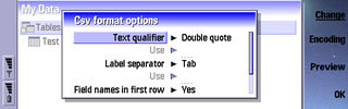 Both packages use a standard Symbian dialog box to define fields in a table, but SmallBase is far richer in the options that's on offer. Whereas PowerData will allow text, number, date and Yes/No fields, SmallBase also offers memo, duration, choice list, telephone number, formula, file links and folder links. You can also specify the look and size of the fields in cardview, grid layout and reports. So for SmallBase it's really field definition and display design at the same time, a solution which work really well once you grasp it.