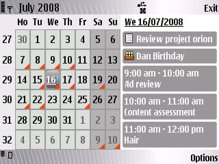The month view splits the screen in two with the upper half showing a calendar, complete with notations for days which have entries. The bottom part of the screen shows the entries for the day currently selected in the calendar shown above. If necessary, the day-listing scrolls up and down in order to show the complete list of entries. This view works very well (it is possible to use the Calendar from this screen alone) and makes very good use of screen real estate.