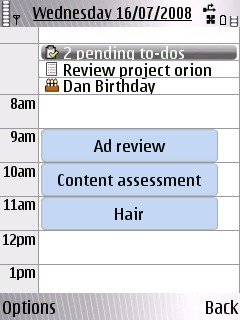 Week view has also been modified; rather than just being a simple grid showing current entries (and free time), it now expands the currently selected day column and shows additional information. This makes it easier to schedule entries in the context of other events. The previous Day view (a list of entries for that day, which was accessible via the month or week views) has been renamed 'agenda view' and is unchanged except that access is via the Options menu. The new Day view has an hourly layout, making it easier to see, at a glance, what your schedule looks like. Day view does require a bit of scrolling, but the advantage of having things laid out hour by hour is that it is easy to see free time slots. If you start typing some text then a new meeting will automatically be created starting at the currently selected time, just as happens in week view. You can also create new Todos, Anniversarys and Memos by pressing the D-pad in. The new event dialogs have been compacted to make better use of the available screen space; it is now possible to see (for adding and editing) all the crucial meeting information in one screen - this not only saves scrolling but makes things much clearer.