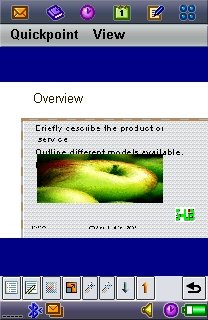 Quickpoint impresses by being the only Powerpoint-editing solution for UIQ but it makes a mess of non-trivial desktop-produced originals, which needed work to fix back in Microsoft Office back on the desktop. The slide preview mode works well, even claiming to drive a Bluetooth projector if you're brave enough to want to try running a presentation directly from your smartphone, although the 'full-screen' menu function makes no attempt to show slides in 'landscape' mode, which is a bit of a waste of screen real estate. Curiously, zooming in goes straight to the largest setting, while zooming out allows all four zoom levels.