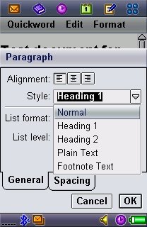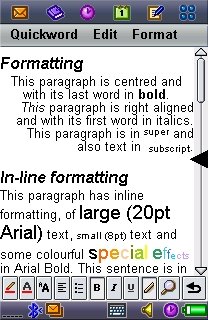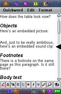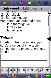 Quickword is a robust and moderately powerful word processor, with good support for paragraph styles ('Format paragraph'), three main display font sizes and the usual variety of coloured font effects. There's still no word count, unfortunately, surely this couldn't be that hard to implement? Some attributes of your desktop Word document are unviewable here, including images and footnotes. Tables are presented a row at a time, with each laid out vertically, making things look more than a little strange.