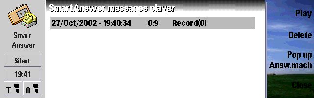 Everything is setup, now it's just a matter of time before someone calls and I can enjoy this new addition to my software library. So let's sit back, relax and wait ... yeah right :p It's been a while since I last called myself, the medication which the doctor subscribed really helped ;) My 92x0 switched to silent and off we go. After the 5 seconds the answering machine jumped in to save the day and perfectly played my wav file followed with a nice beep. But to my disappointment that wasn't all I heard :s The answering machine isn't able to turn off the 92x0 microphone which resulted in the fact that the caller can still hear everything what is going on. A true appkiller, but a quick mail to SymbianWare confirmed that they are doing all they can to solve this problem as fast as possible, Nokia(at least they promised) will be giving them a hand on this, since the problem resides in the Nokia OS. I'm starting to see why no other developer was able to produce an app like this. But enough about this .... when someone calls you and answering machine is turned on you'll of course still have the option to answer it manually (in my case you'll have to be damn quick ;) ) if you don't, the answering machine will take the message and store it as a wav file. You can then listen to (delete/pack) them in the message player.