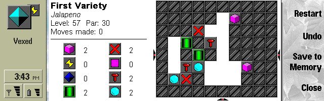 Vexed is a wonderfully simple puzzle game based upon moving blocks so that adjacent blocks of the same type disappear. The object is to clear the grid. Their are up to 8 different block types per puzzle grid. The block you wish to move is identified by using the direction pad to move the arrows at the bottom and right hand side of the screen the selected block being the one at the intersection. This block can be moved either left or right (providing its not blocked) by pressing
